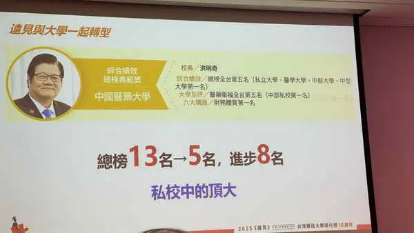 中國醫藥大學榮獲2025年《遠見雜誌》台灣最佳大學綜合績效總榜單前5強
