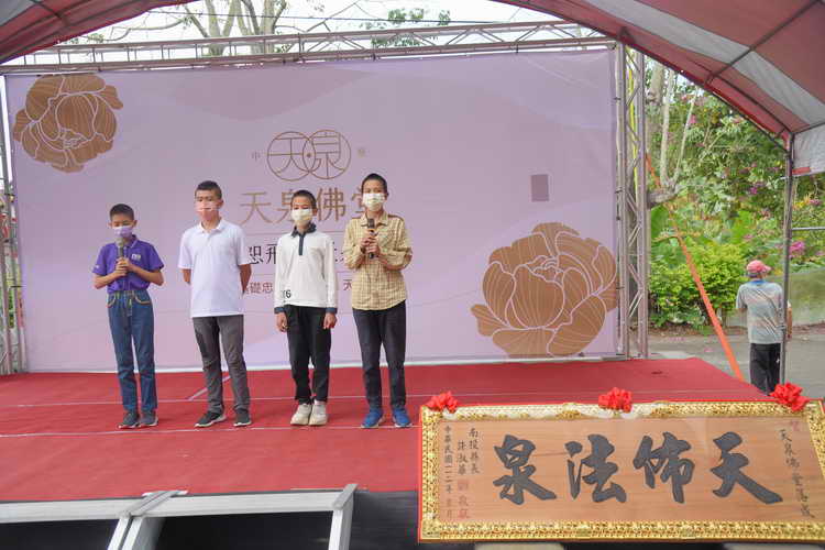 位於龍南路上的天泉佛堂,舉辦落成活動,縣長許淑華贈匾祝賀,道親歡喜參與外,年輕的道親也站在台上,場背誦論語等儒家古籍經典,儀式莊重。