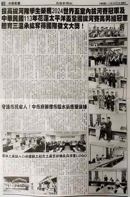 南投高中體育三宋于恩、張皓喆二位學生,獲選參加2024世界盃室內拔河賽(2024 TWIF WORLD INDOOR CHAMPIONSHIPS),2/8-2/11前往瑞典赫爾辛堡參加比賽,2/10當天奪下U23男女混合組560公斤級金牌,為校、為國爭光,返國後,學校立即頒發1萬元獎勵金予以鼓勵,並宴請相關有功人員。
