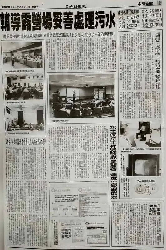 近年露營人數及露營場數量增加,南投縣露營場數量位居全台第二,且南投縣草屯鎮烏溪鳥嘴潭人工湖已提前供水,為避免露營場產生之沖洗式廁所排水及生活雜排水,未採取納入污水下水道系統、集中處理場或委託廢水代處理業處理,而有未收集或未設置建築物污水處理設施處理者,對水體品質將造成相當程度危害。南投縣環境保護局於113年8月21日及22日共辦理4場水污染防治法規宣導說明會,詳細說明應收集處理之露營場內污水來源,及如何計算足夠容量之污水處理設施容量,希冀提升業者對法規的理解並遵循法令,並依法改善現有設備不足。本次說明會除說明水污染防治法之內容,亦邀請縣府觀光處共同參與,輔導露營場申請及回覆各項疑問,會中業者發言踴躍,環保局亦逐案說明業者疑問,共同朝向合法化努力。
