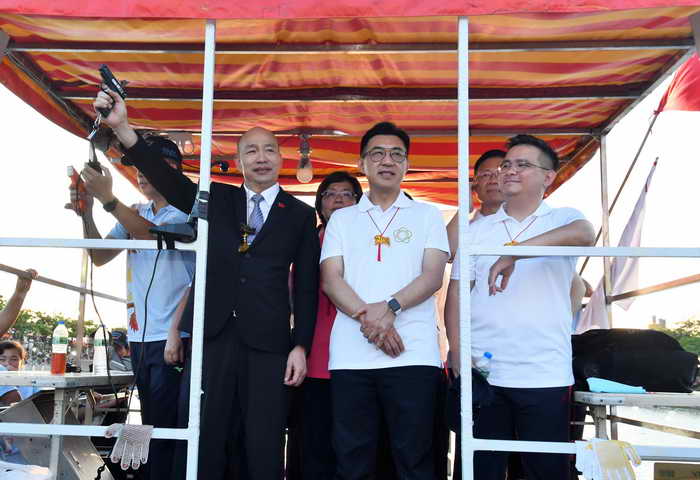 【記者張德欽、吳三伯、温玉沛/彰化報導】「鹿港慶端陽系列活動-國際龍舟錦標賽」今(8)日晚間於福鹿溪水道盛大開幕,由地主彰化縣長王惠美主持,首度由立法院長韓國瑜、副院長江啟臣與立委謝衣鳯等多位立委組團,另外,臺中市政府副市長鄭照新、南投縣政府由秘書長洪瑞智,率團隊參加友誼邀請賽,展現中彰投縣市友好共榮,還有職棒超高人氣的味全龍小龍女啦啦隊前來一起體驗熱血沸騰的划龍舟,現場兩岸擠滿來自國內外的民眾、觀光客,為選手加油。