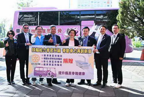 國際扶輪社3462地區前總監楊曜聰表示,感謝王縣長縣府團隊的用心,守護縣民從產檢、幼兒照顧到長輩各項福利。長輩骨質疏鬆問題嚴重,一旦跌倒可能引發內出血等致命風險,未來可以透過檢測車,結合社區「不老健身房」進行數據比對,協助長輩預防骨質流失的各項風險。