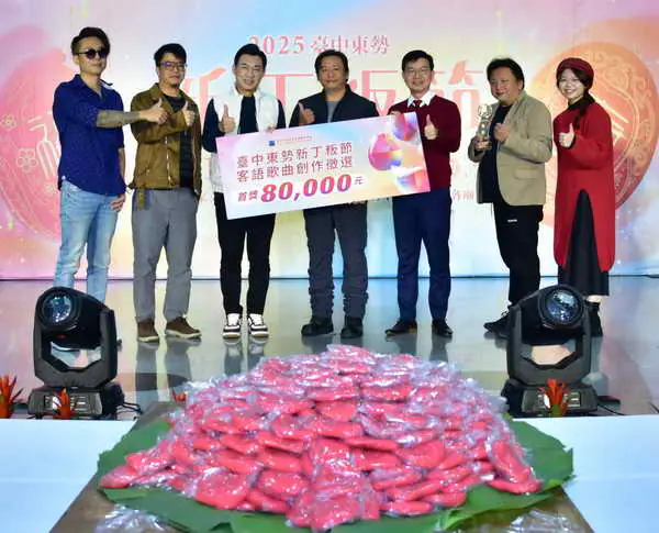 台中市政府客委會說明,今日記者會由土牛國小客家歌謠表演活力開場,首度公開發表台中東勢新丁粄節客語創作歌曲首獎作品《幸福新丁粄》,非常符合節慶氛圍,並舉行頒獎儀式,由創作者邱嘉樑獲得8萬元獎金;現場由江主委帶領來賓於啟動裝置中注入活水,宣告「2025台中東勢新丁粄節」隆重登場,正式邀請全國民眾「正月半,來東勢,食大粄」。更多活動訊息可至「台中東勢新丁粄節」臉書粉絲專頁(https://www.facebook.com/SinDingBan)查詢。