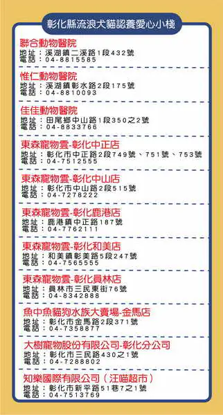 【記者張德欽、吳三伯、温玉沛/彰化報導】彰化縣政府為提升本縣流浪犬貓認養率,幫流浪犬貓找到一個幸福的家,每年配合縣內各項大型親子活動,如花在彰化、兒童節系列活動、植樹節及彰化畜產嘉年華等相關大型活動,皆出動寵物認養專車辦理流浪犬免費認養及動物保護教育宣導活動;另外還配合彰化縣轄內動物醫院及寵物業設立「彰化縣流浪動物愛心認養小棧」,包含3家動物醫院及8家寵物用品店(如圖示),共同辦理多點免費流浪犬貓認養活動。