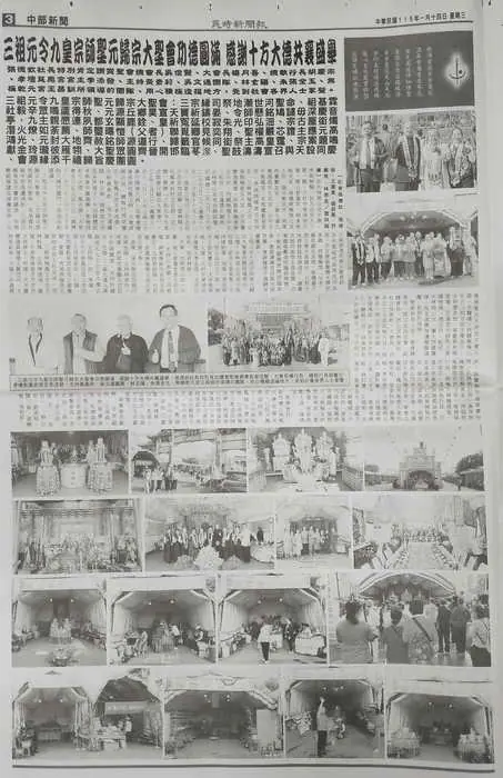 三祖元令九皇宗師聖元歸宗大聖會合辦設壇單位:主壇:水林開山宮宮主吳信賢、副宮主張美聖、主持陳昭螢。地壇:虎尾無極一旨五母宮天下第一館宮主張吳寶忍、主持張榮統。人壇:大村中華淨明宗壇壇主李金容、主持江佳玲、長老林鈴。,