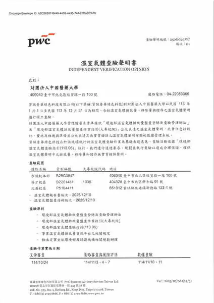 此次查驗機構認証,盤查範圍涵蓋本校三個校區之教學、研究與行政單位;透過系統性盤點三個校區之能源使用、設備運作及相關排放來源,為後續減碳策略擬定、能源效率提升與低碳校園建構奠定關鍵基礎;肯定中國醫藥大學在溫室氣體盤查制度、排放數據品質與管理流程上,已符合環境部認證的第三方查驗標準,並展現本校以科學化、制度化方式推動校園碳管理,主動承擔因應氣候變遷與減碳行動之大學社會責任。