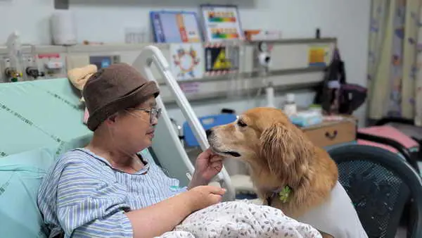 圖二:釋如意師父在住院期間與狗醫生溫馨互動,轉移對病痛的苦。