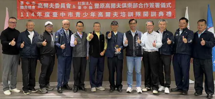 今日簽署儀式包括市議員陳清龍、運動局長游志祥、台中市體育總會高爾夫委員會主委張世禎、副主委張智賢、副主委楊明勳、副主委黃文正、豐原高爾夫俱樂部理事長張炳坤、副總經理邱建國、常務理事郭銘勳、理事張鴻霖、理事張榮財、監事張晉麟及114年台中市青少年高爾夫培訓隊共16名選手皆到場支持。