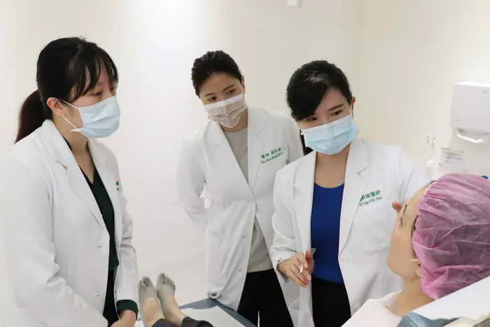 圖二:黃昭瑜主任(右一)指導醫師如何使用玻尿酸進行韌帶拉提。