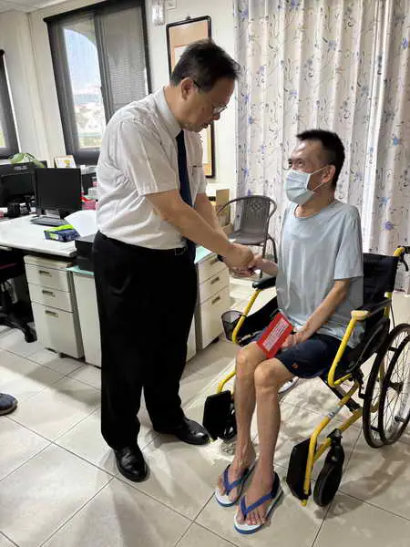 這是李先生出獄後所過的第一個中秋節,沒有家人陪伴,但有各界長官到場給鼓勵支持,郭檢察長除了關心李先生的日常生活及身體健康,也不斷給予打氣鼓勵,認為做錯事已經接受處罰,人生應該往前看,要要有耐心去接受醫療、努力復健,活著才有希望,仍有機會體會美好人生,早日恢復健康、照顧好自己,不要放棄,當檢察長握起個案的手時,大家也集體希望個案加油,李先生難掩感動之情,內心充滿社會的關懷與溫暖,而有難忘的中秋節。