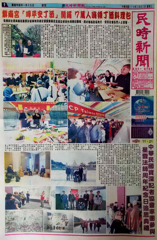 佛光山於2月24日起舉辦週年追思典禮,除了各及政要紛紛前往參與追思典禮,大批來自各地的信眾也趕赴典禮會場表達追思的意念,使得整個位於大樹區的佛陀紀念館顯得人山人海,中華民國資深記者協會由團長賴連金(理事長)、榮譽團長洪錫銘(創會理事長)、常務理事楊川欽、蘇正國(南華報副社長)、張思右(世紀新聞撰述委員)、周正堂(世紀新聞特派)、曾重堯(南華報桃竹苗特派記者)等一行十人,專訪佛光山「佛陀紀念館」,由負責禮賓的妙會法師等安排進入法會現場致意。
