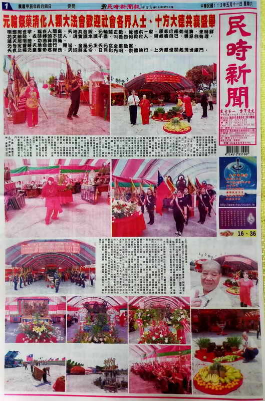 【記者張德欽、張珊瑜、林進殿、張祐瑄、張耿慈\南投報導】由金凰元主天元宮天元宗師府主辦的「元輪祭菓清化人類大法會」,自國曆113年5月4日至113年5月27日(農曆3月26日至4月20日)共24昹日在南投市福山里299號廣場盛大舉行,農曆3月26日上午10時30分開香,由主事:天靈師潘憶玄主持,主任委員張國政、副主任委員:林燈坤、黃榮鴻,行政顧問:吳啟萱,林欽盛伉儷、陳四海、大宇宙新聞時報社社長張德欽暨全體工作人員各界人士共襄盛舉,有水就有魚千年育,草有萬年根萬年旺祝賀「大家提昇開運好頭彩、歡喜笑咪咪、祝福大家大賺錢」,祈求風調雨順、國泰民安,福佑蒼生。過去的不講、未來的不想,做好當下事、來者惜緣、去自然,113年(農曆3月26日至4月20日止)農曆4月20日未時普桌開香法會功德圓滿。