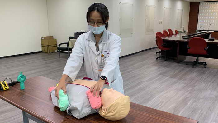 圖二:臺中醫院急診室主任陳莉瑋在記者會現場示範熱傷害急救方式。