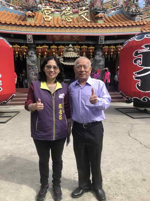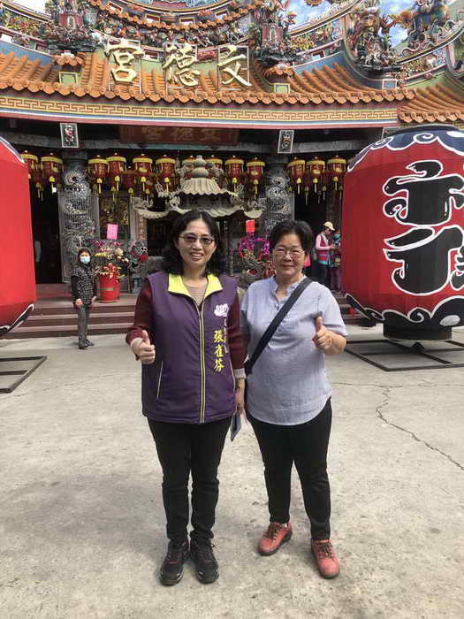圖二:文化局長張雀芬與大宇宙民時新聞時報記者温玉沛在花壇鄉文德宮現場合影。(記者吳三伯攝)