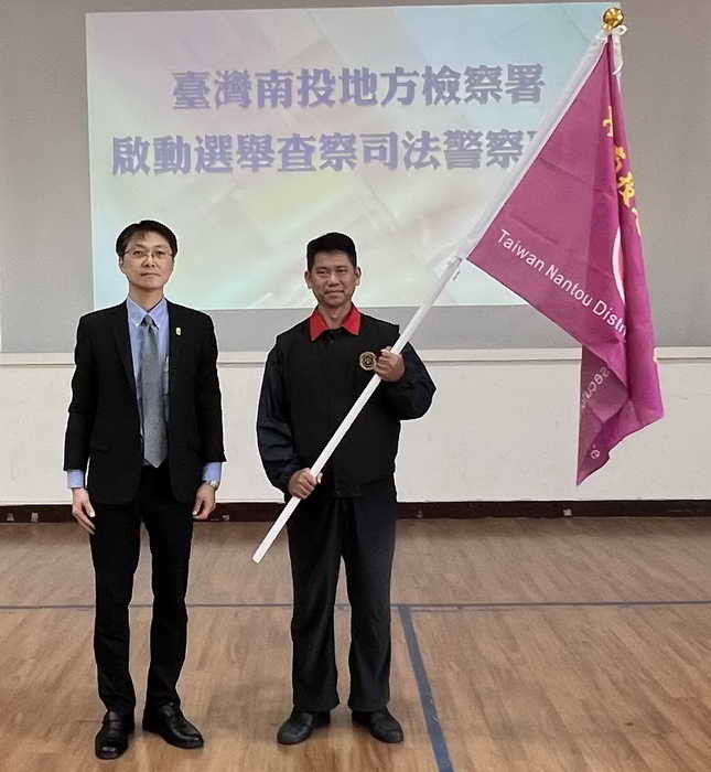 南投地檢署「選舉查察司法警察專隊」由本署選舉專責檢察事務官3人、法務部調查局中部地區機動工作站調查官5人、南投縣政府警察局刑事警察大隊刑警5人共同組成,本署黃元冠檢察長並親自授旗給檢警調合組的司法警察專隊,由本署檢察事務官組長林政益、南投縣政府警察局刑事警察大隊傅堃旗副大隊長、中部地區機動工作站康珮瑱組長共同代表接受此專責任務。