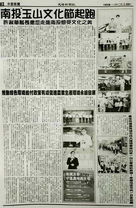 另活動也以導覽走讀方式呈現南投縣豐富的特色文化,12月16日在水里、草屯舉行鄉鎮特色的走讀活動,呈現具有「人文內涵 x 旅遊體驗 x 在地私房景點」的深度文化小旅,包括「走讀草屯」與「走讀水里小台北」行程,讓遊客更深入體驗南投獨有的文化風情。詳細資訊可至「2023南投玉山文化節」FB粉絲專頁(https://reurl.cc/q027x3)或活動網站(https://mtjade2023.com/)查詢。