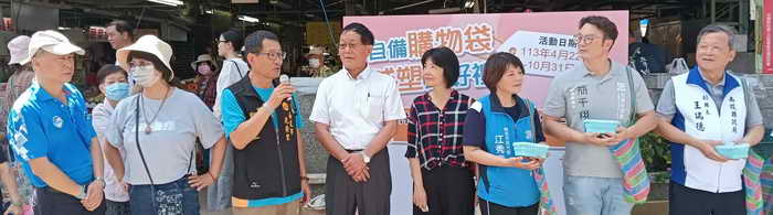 【記者張德欽、張珊瑜、林大森、蔡瑛芝/南投報導】南投縣政府為鼓勵市場攤商及民眾能夠減少使用購物用塑膠袋,113年度輔導中興新村第一市場、第三市場及光明市場3處市場共304家攤商,配合實施不提供購物用塑膠袋政策,並推出自備購物袋送好禮活動,6月23日由副縣長王瑞德率領縣府環保局同仁到第三市場進行擴大宣導,以實際行動展現減塑決心,廣邀民眾加入。