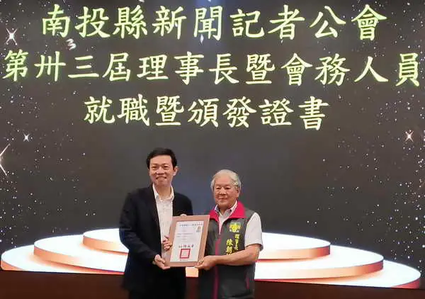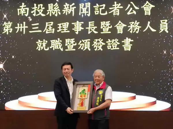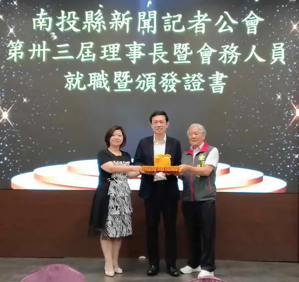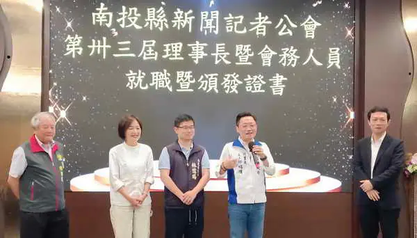 【記者張德欽、張珊瑜、林大森、蔡瑛芝/南投報導】南投縣新聞記者公會115年4月15日中午在南島餐廳舉辦第33屆理事長交接暨理監事就職典禮,新任理事長陳朝枝、卸任理事長黃淑真印信交接,由南投縣府新聞及行政處處長蔡明志擔任監交人,在全體與會人員見證下圓滿完成,同時頒發理監事當選證書及顧問.會務幹部聘書,立委馬文君秘書陳寬飛、縣議員林儒暘、計畫處長邱紹偉、縣議員參選人黃馨瑩、新聞及行政處副處長施東憲、黃湘玲科長、黃瑛光、廖維士、縣農會總幹事曾明瑞、南投縣同鄉總會長林哲生、江秀春代表、李清信等顧問共襄盛舉,蔡處長希望未來在南投縣的記者能夠帶給所有民眾最真實的訊息,理事長陳朝枝感謝各界人士的支持鼓勵,就職典禮圓滿成功。