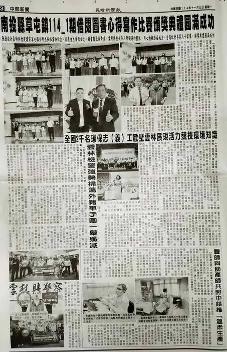 【記者張德欽、張珊瑜、游雅嵐、廖淑子/南投報導】南投縣草屯鎮114-1期借閱圖書心得寫作比賽頒獎典禮於11月2日上午在南投縣草屯鎮公所五樓國際會議廳舉行,由草屯鎮公所主任秘書許秋金主持,代表會主席陳文忠、圖書館長林秀貞、業照祺等各校長、張德欽社長及各界電子、平面媒體記者與會共襄盛舉,張德欽社長特別肯定讚賞草屯鎮公所主任秘書許秋金、代表會主席陳文忠、圖書館長林秀貞、業照祺校長等人所領導的團隊、用心積極造福地方,受到社會各界人士掌聲,頒獎典禮圓滿成功。