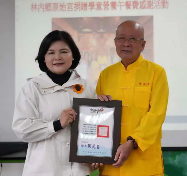 圖文:原始宮捐助學童午餐費11年不輟 張麗善縣長赴民生國小致贈感謝狀。