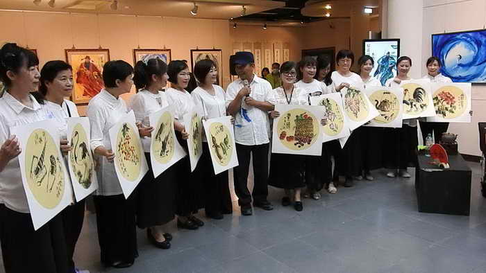 劉大師現場揮毫3幅流彩畫後與大家合影留念並表示:其授業之8位學生, 7月1日至9月30日在嘉義新港古民街61號,微田藝術空間有虎尾西畫會自我創作風展出,開幕式:7月6日(星期六)早上10點歡迎再度蒞臨。