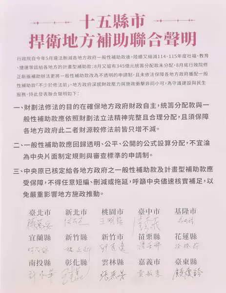 今日15縣市共同發布聯合聲明,提出三大訴求,包含一、財劃法修法的目的在確保地方政府財政自主,統籌分配款與一般性補助款應依照財劃法立法精神完整且合理分配,且須保障各地方政府此二者財源較修法前皆只增不減。