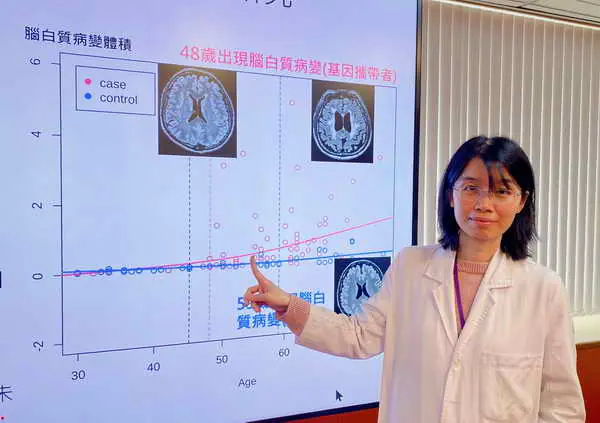 臺中榮總神經醫學中心神經內科董欣醫師、醫學研究部陳享民研究員、陳一銘主任、影像醫學部陳虹潔主任、失智症中心李威儒主任研究發現,R544C變異者從48歲起出現白質病變快速惡化的趨勢,遠快於正常人。