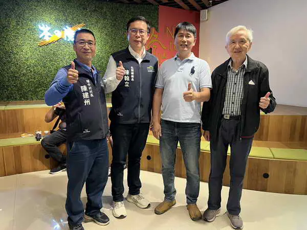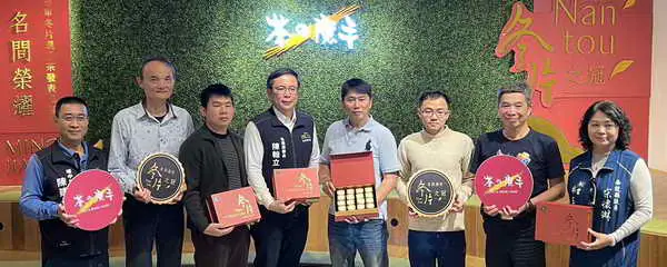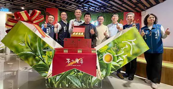 圖文:名間之光 冬片之冠 茶之魔手114年冠軍冬片選手查禮盒封藏上市 1500盒珍稀開賣,張德欽社長與南投縣新聞記者公會常務理事林大森及林凌霄記者特別肯定讚賞名間鄉長陳翰立、茶之魔手董事長王賢明所領導的團隊、用心積極造福地方,受到社會各界人士掌聲。