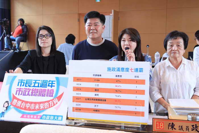 吳瓊華議員提到,市長太客氣,我用客觀的民調數據來看台中的施政成績。今年以來,從TVBS、三立、匯流、遠見「2023縣市長施政滿意度調查」到台灣世界新聞傳播協會的縣市長滿意度調查,以及天下雜誌施政滿意度、今周刊「2023年永續城市SDGs大調查」,盧市長接拿下施政滿意度最佳或最佳首長信任獎,光是今年就已經拿下七連霸!
