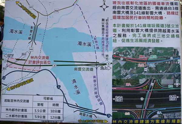 雲林縣長張麗善表示,王惠美縣長為打通南彰化二水田中對外交通,在111年10月26日透過立法院交通委員會向當時的交通部長王國材爭取南彰化透過彰雲大橋(141線)銜接國道3號的計畫,同時也一併拓寬141線,本人隨即交代縣府交工局於111年11月20日,由兩縣簽署「國道3號增設林內交流道」案合作意向書,並自112年自籌經費新台幣700萬辦理發包,進行可行性評估及規劃案,於今(113)年1月完成可行性評估,在今年5月完成規劃報告。