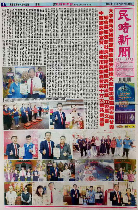 圖文:大宇宙祈安植福蓬萊仙島安地境大聖會圓滿成功天降甘霖 總會長張德欽社長感謝南投縣長許淑華 立法委員馬文君 中寮鄉長廖宜賢、南投市長張嘉哲前南投縣議會副議長簡榮梁、無極龍鳳大天宮簡瑞成、玻璃媽祖廟台灣護聖宮古睢伯伯等十方大德共襄盛舉。