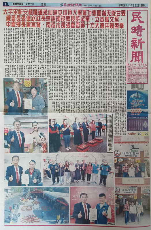 圖文:大宇宙祈安植福蓬萊仙島安地境大聖會圓滿成功天降甘霖 總會長張德欽社長感謝南投縣長許淑華 立法委員馬文君 中寮鄉長廖宜賢、南投市長張嘉哲前南投縣議會副議長簡榮梁、無極龍鳳大天宮簡瑞成、玻璃媽祖廟台灣護聖宮古睢伯伯等十方大德共襄盛舉。