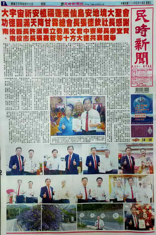 圖文:大宇宙祈安植福蓬萊仙島安地境大聖會圓滿成功天降甘霖 總會長張德欽社長感謝南投縣長許淑華 立法委員馬文君 中寮鄉長廖宜賢、南投市長張嘉哲、農業處長蘇瑞祥、蔡明志處長、財政處長李良珠、地政處長唐仁梂、工務處長張弘岳、玻璃媽祖廟台灣護聖宮古睢伯伯等十方大德共襄盛舉。