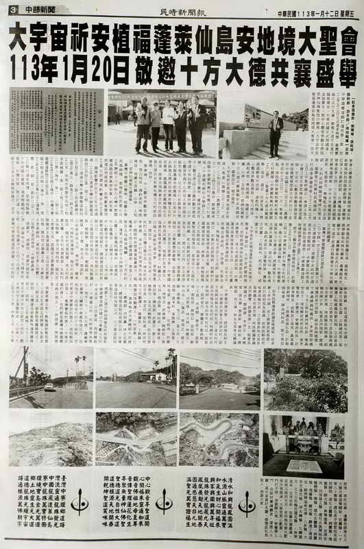 圖文:大宇宙祈安植福蓬萊仙島安地境大聖會113年1月20日(農曆癸卯年12月10日)舉行,敬邀十方大德共襄盛舉、臺灣中寮環鄉道路打通任督二脈,將帶動地方經濟發展。