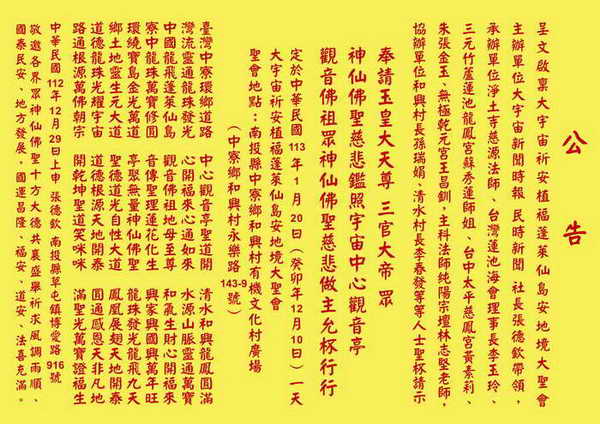 大宇宙祈安植福蓬萊仙島安地境大聖會113年1月20日敬邀十方大德共襄盛舉2