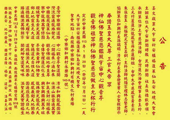【記者張德欽、張珊瑜、張祐瑄、張耿慈、游冬郎/南投報導】臺灣中寮環鄉道路打通任督二脈、於113年1月10日正式通車典禮,臺灣寶島正式行大運、紫微大道宇宙運行龍珠發光、中華民國正式開國運,造福蒼生,經中心觀音亭觀音佛祖衆神仙佛聖指示辦理【大宇宙祈安植福蓬萊仙島安地境大聖會】由大聖會主辦單位大宇宙新聞時報 民時新聞 社長張德欽帶領,承辦單位淨土寺慈源法師、台灣蓮池海會理事長李玉玲、三元竹蘆蓮池龍鳳宮蘇秀蓮師姐、台中太平慈鳳宮黃素莉、朱張金玉、無極乾元宮王昌釧,主科法師純陽宗壇林志堅老師,協辦單位和興村長孫瑞娟、清水村長李春發等等人士112年12月29日上午聖杯請示,奉請玉皇大天尊 三官大帝 衆神仙佛聖慈悲鑑照、宇宙中心觀音亭觀音佛祖衆神仙佛聖慈悲做主允杯行行,定於中華民國113年1月20日(農曆癸卯年12月10日)一天,聖會地點:南投縣中寮鄉和興村有機文化村廣場(中寮鄉和興村永樂路143-9號),敬邀十方大德共襄盛舉,福安、道安、法喜充滿、聘請道教高功法師、道教科儀,中心觀音亭觀音佛祖、雪山地母、鴻鈞老祖,準提佛母、地藏王菩薩,山神、土地公、衆神仙佛聖十方大德共襄盛舉祈求風調雨順、國泰民安、地方發展。