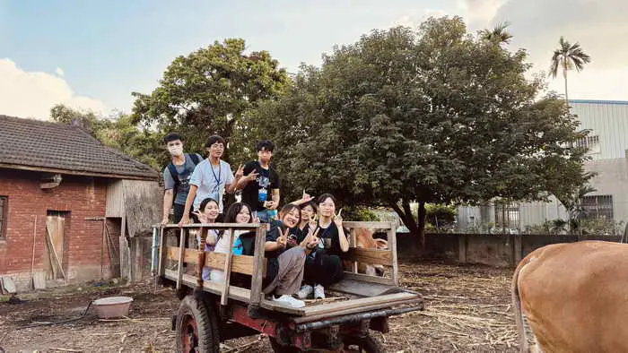 圖二:大葉大學創新提案實務訓練課程學生體驗坐牛車。(記者吳三伯攝)