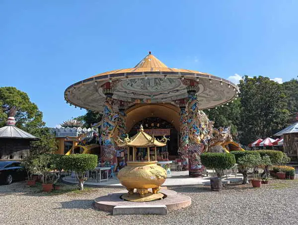 十九龍柱又稱(護國天柱),高達三十公尺 ,由十九條金龍盤旋而上,柱頂塑觀世音菩薩立像,持淨瓶柳枝,象徵澤被蒼生:高高的矗立在廟前廣場左前方;是全台最高的龍柱,夜間可由十九條龍的眼睛發出三十八道強力燈光,閃爍耀眼的光芒四射,蔚為奇觀,據了解,此一巨型龍柱建造經費,全數均由一位賣檳榔的老嫗所捐獻。