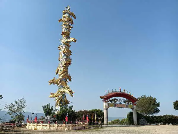 【記者張德欽、張珊瑜、張祐瑄、張耿慈、官庭瑪/南投報導】天下第一大龍柱位於慈德宮南投縣草屯鎮南側的虎山頂上,據說慈德宮其建築有三奇。第一奇是外形如同一個臥倒的葫蘆,故有「葫蘆廟」之稱。 第二奇是廟口以四支龍柱橕起的斗苙形拜亭。 第三奇則是高達三十公尺之護國天柱,高聳特立,屹立挺拔,高柱頂部還有一尊莊嚴的觀世音菩薩、是天下第一大龍柱,地靈人傑吸引各界靈山修道人士鳳儀君、游柳枝、謝采如、洪碧惠、張德欽社長與陳廷淳大師、詹素球仙姑、七星大師、等各界人士前往、慕名而來的信徒也不在少數,為方便各界人士前來,過午、過晚飲食問題,即日起免費提供泡麵食用、開緣開大運。