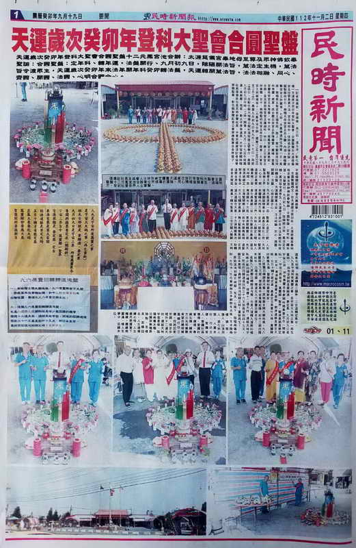 【記者張德欽、張珊瑜、吳三伯、溫玉沛/彰化報導】天運歲次癸卯年登科大聖會:合圓聖盤由大源慈儀宮主任委員黃天法、宮主林明中、住持吳芝瑜主辦,合圓聖盤由台北:無極天母宮宮主呂玉蘭,內湖:無極靈賢宮宮主許麗香,七股:天鳳佛道院住持黃一壬,高雄:無極紫玄聖宮宮主楊芳枝,路上:紫竹觀音寺住持林秀蘭,將軍:西台觀玄宮宮主許陳麗雲,霧峰:皇鳳宮靈母宮宮主朱秀春,台中太平:慈鳳宮宮主黃素莉,台南:金玉旨慈母宮宮主詹淑吟,林口:無上元宮宮主林春霞,台中:無極聖明宮宮主李亞芟,屏東:天華宮宮主胡毓珊等十二元鳳宮池合辦:國曆112年10月23日至11月10日(農曆九月初九日至九月二十七日)為期18詠日,在彰化縣大城鄉公舘村頂股路18號舉行,農曆九月初九日午時(11時)開香,至九月二十七日午時圓滿,吳無塵、飛哥、劉太平等等道長、大宇宙新聞時報社長張德欽也是民時新聞社長、中華民國資深記者協會常務監事、彰化縣新聞記者公會常務監事及各界電子、平面媒體記者與會共襄盛舉。