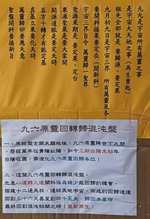 合圓聖盤榜文:在天運歲次癸卯年,太源慈儀宮奉地母至尊及衆神佛欽奉聖諭:合圓聖盤:定年科、轉年運,法盤開行、九月初九日,陰陽開法旨,萬法定生機,萬法旨令渡衆生,天運歲次癸卯年末法年開年科癸卯轉法盤,天運轉開萬法旨,法法相融、同心、齊圓、開圓、法圓、心明合圓合心。