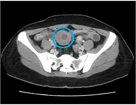 圖二:小腸套疊腹部電腦斷層影像(圈圈處)。