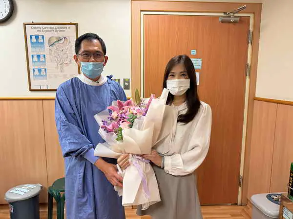 圖一:陳小姐回診時特別準備花束感恩大腸直腸外科主任邱建銘,頻頻道謝:「邱醫師是我的再生父母!」