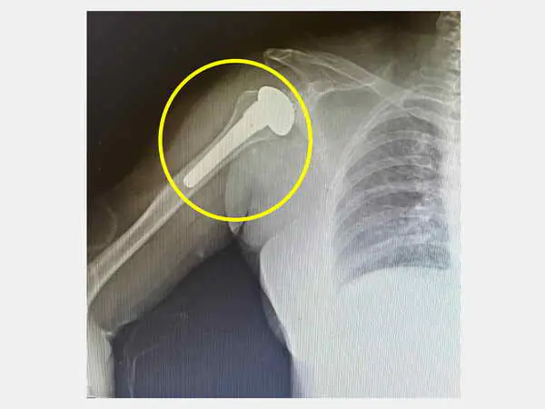 圖二:女運將右肩關節退化經全人工肩關節置換手術(圓圈處)後,並搭配復健,減輕肩膀疼痛。