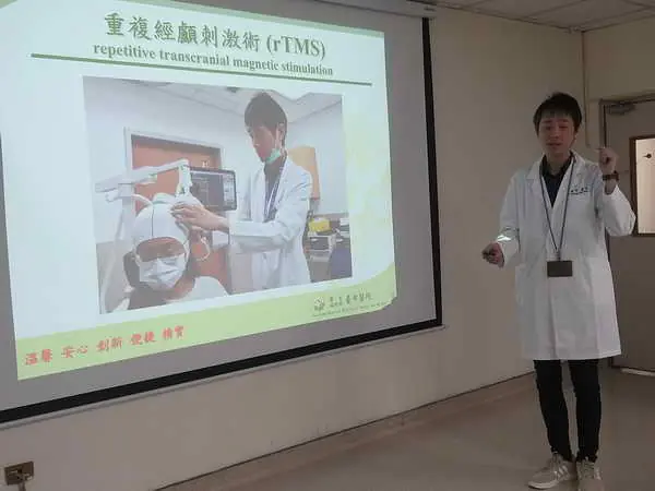 圖二:章秉純醫師介紹,「rtms 重複經顱磁刺激治療」,主要是透過磁刺激到負責思考的人腦前額葉部位,活化其思考。