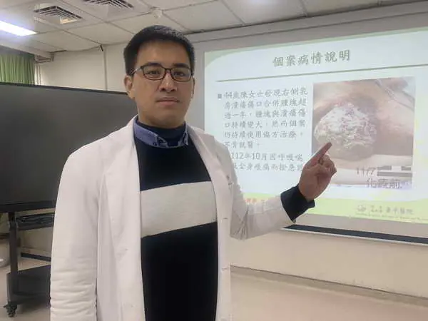 臺中醫院一般外科暨乳房外科醫師楊聖睿指出,陳女士是家庭主婦,與老公育有一子一女,因為半年內腫瘤迅速腫大且持續潰瘍滲血,導致衣服一穿上身就被沾濕沾髒、甚至傷口痛到無法走路。