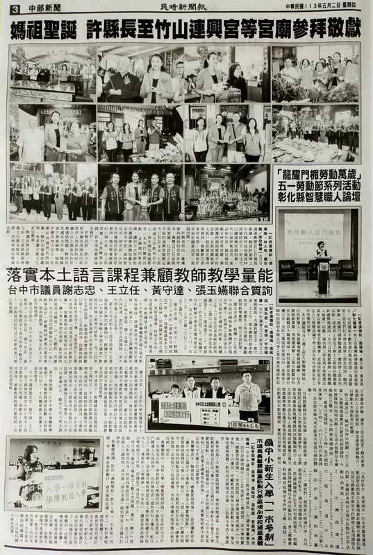 許縣長指出,臺灣參拜媽祖的信眾非常多,農曆3月23日是媽祖聖誕,位在竹山鎮市區的連興宮建廟迄今已有3百多年,可說是地方宗教信仰中心,每年媽祖聖誕都有一系列的慶祝活動,並辦理法會普渡,讓四方大眾都能共襄盛舉為媽祖慶生並祈求平安,湄洲聖母宮、祝天宮、天林宮同樣吸引許多信眾參拜,她也帶著虔誠的心與大家一同上香祝壽,並致贈香油錢,祈求南投發展越來越好。