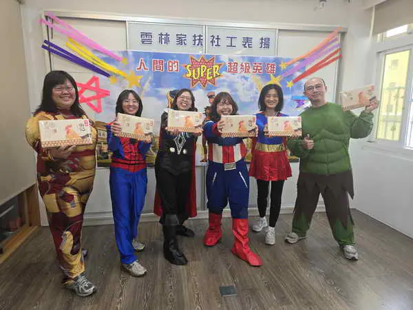 雲林家扶陳燦勲主委肯定獲獎社工,照顧弱勢兒少與家庭,串接各項資源,輔導與陪伴,猶如「英雄」的存在,特別頒發獲獎社工「英雄」紅包,給予最佳肯定鼓勵。吳裕田副主委送來「英雄能量飲-滴雞精」滋養身體,期盼社工英雄們照顧弱勢族群同時,更要維持強健的體魄。