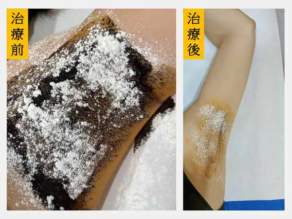 圖二:腋下出汗在治療前以碘澱粉測試呈現大片斑塊,代表出汗旺盛(左圖);治療後斑塊淡化,顯示汗腺活性大幅降低。(右圖)。