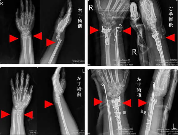 蘇伯翰醫師指出,該名傷患送至本院急診後,即時進行復位與石膏固定,並於24小時內安排開刀,採用「多主治協同手術模式」,由三位主治醫師同時操作左右手四處骨折微創手術,縮短手術時間至約一小時,協同分工可加快病患恢復速度,並提升安全性。患者傷口小、出血少,隔天即可開始復健,三天後平安出院,恢復良好。